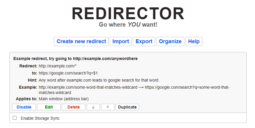 - Once the add-in/extension is installed, you will need to configure the redirects. Open the extension settings and you should see the default screen similar to this:
