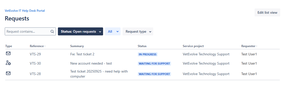 Once you click on requests - you will see a list of your tickets and their current status:
