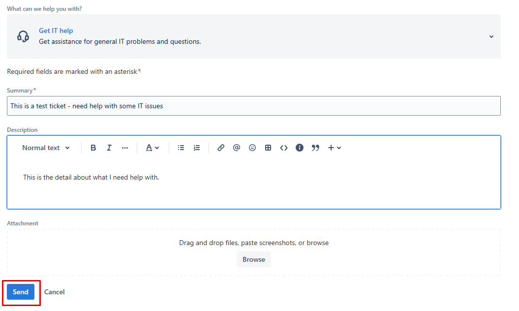 Each request type will walk you through the details need to submit your request. Once the detail are complete and you have attached any relevant screenshots or document, click the send button and your ticket will be created.