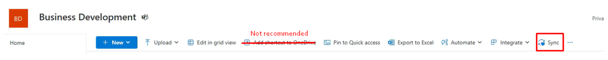 For example to Sync the Business Development document library – browse to https://vetevolve.sharepoint.com/sites/BusinessDevelopment/Shared%20Documents