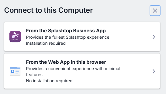 Using the Splashtop Business App is more feature rich and generally has better performance, but requires you to be able to install the app on the computer you are working from. You can find more about how to use the Business App here.