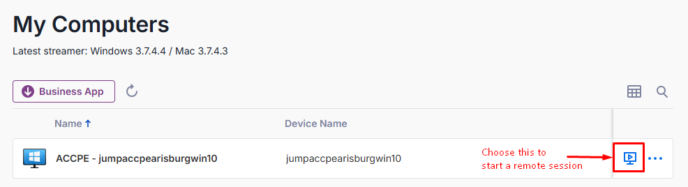 Once signed in you should see a list of computers you can access and some icons to the right. The ellipsis icon gives you a menu to do a few housekeeping items like reboot the computer or look at the properties. The "start session" icon in the one you will want to primarily use.