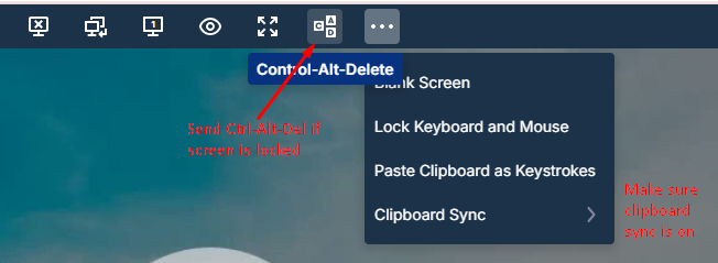 There are icons at the top to that are mostly self-explanatory - but it is important to know how to send the Ctrl-Alt-Del sequence if the